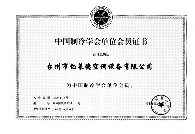 中國制冷學會單位會員證書