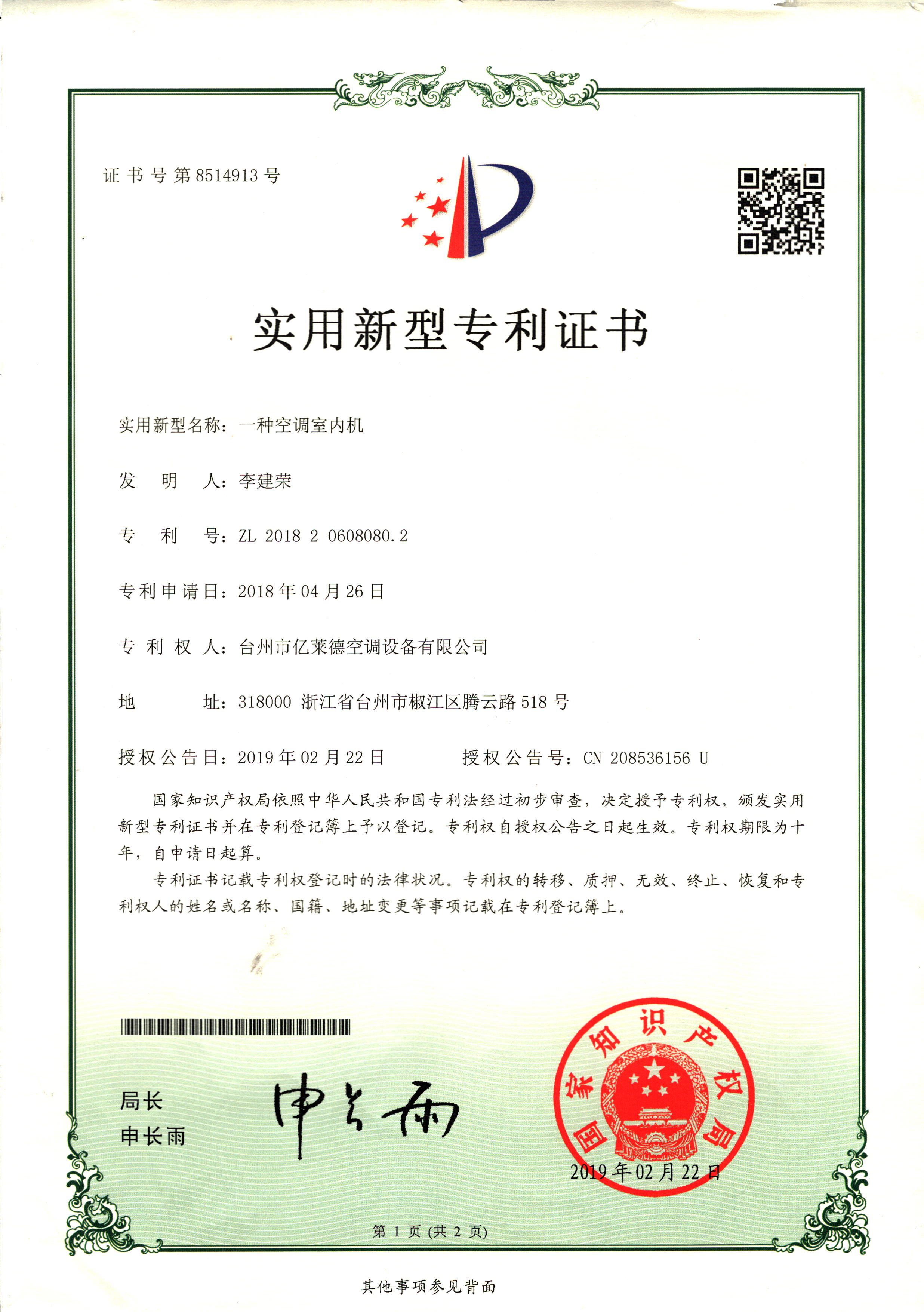實用新型專利證書--一種室內(nèi)冷暖...
