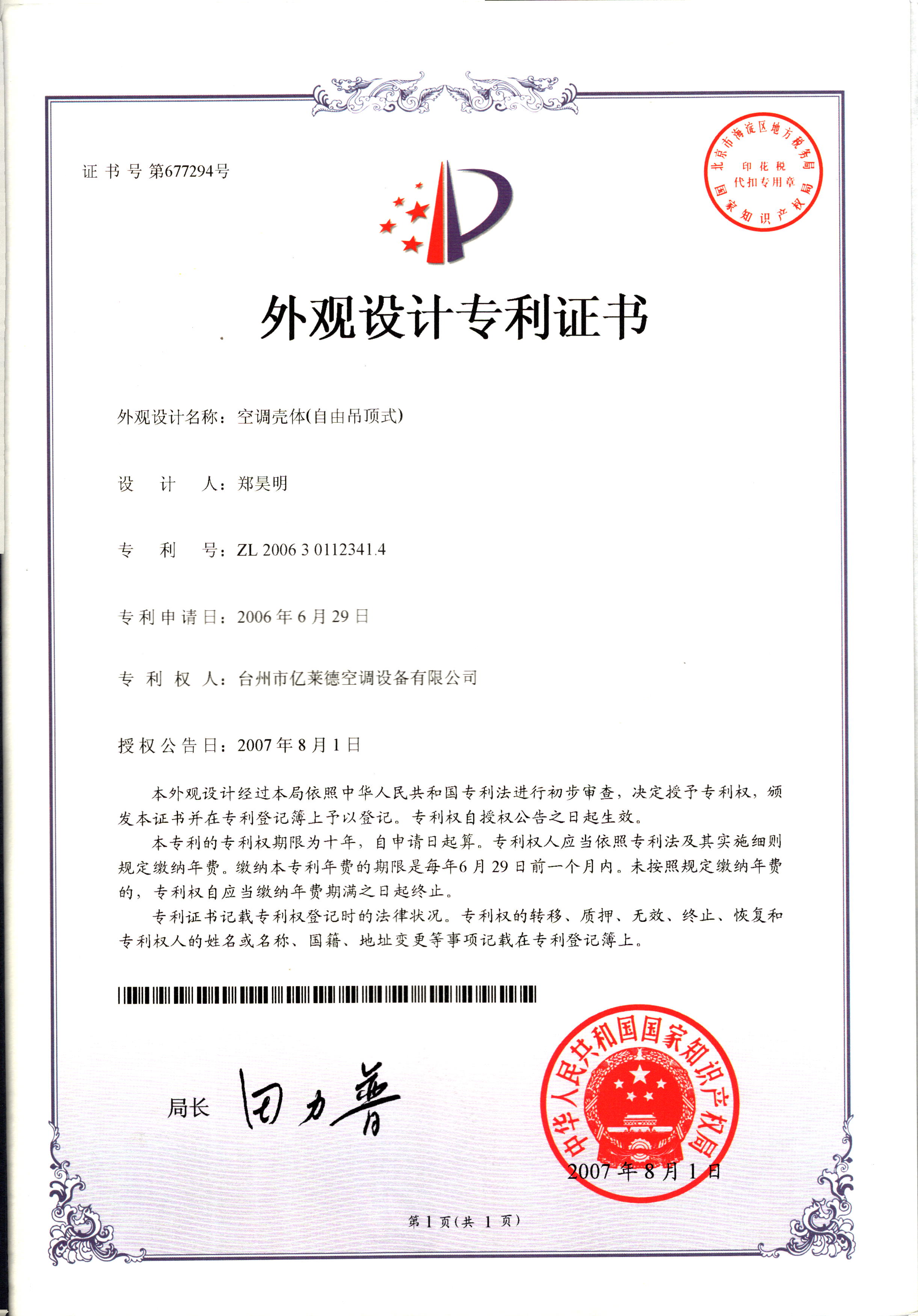 外觀設計專利證書--空調殼體(自由...