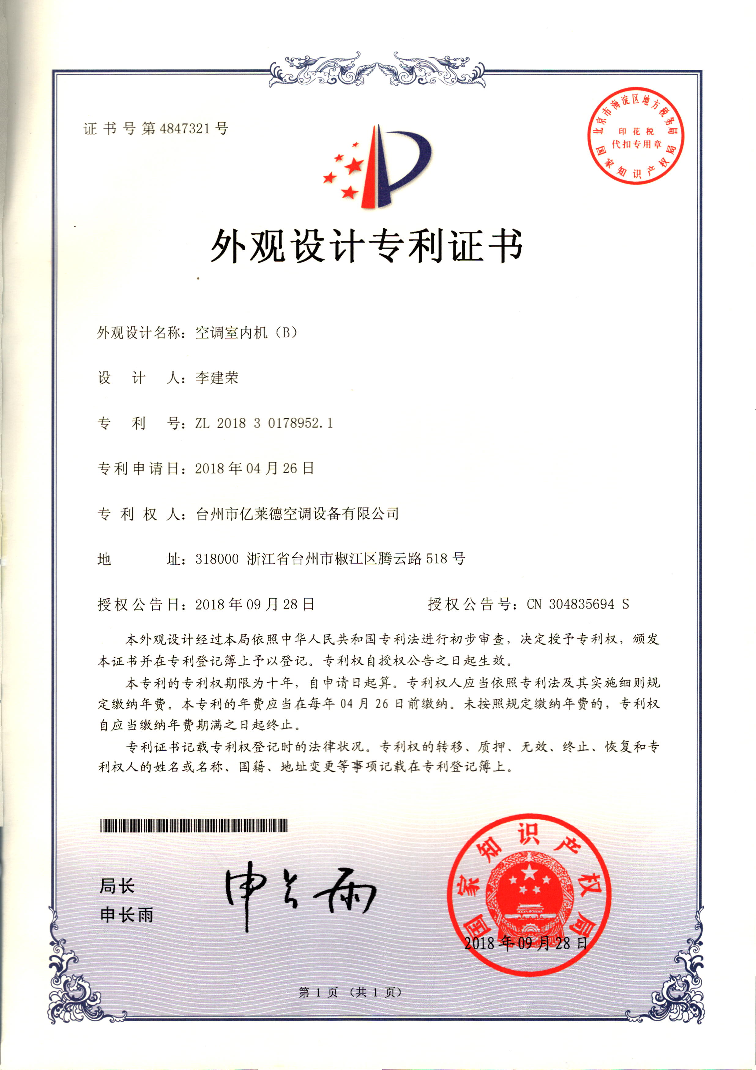 外觀設計專利證書--空調室內(nèi)機(B...