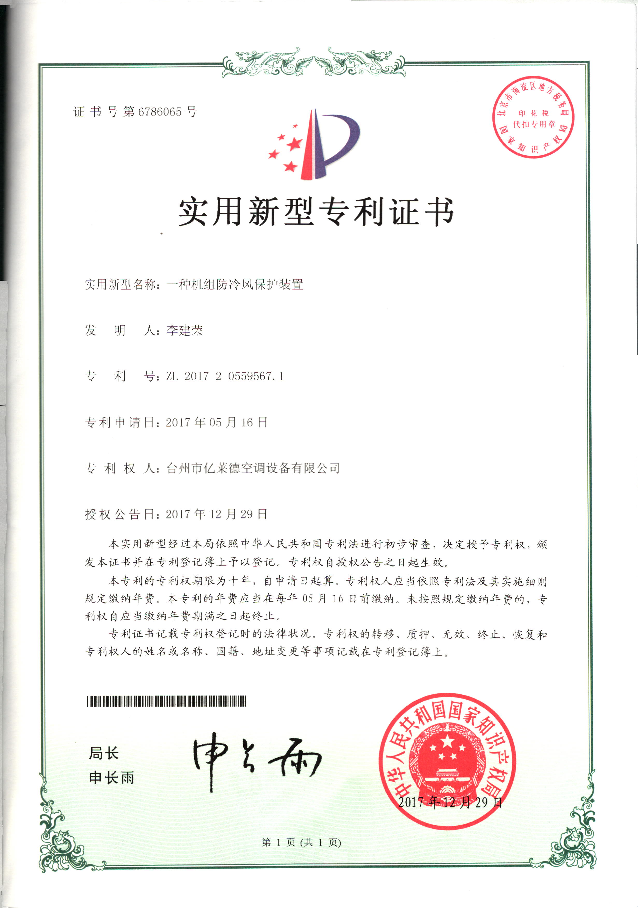 實用型專利證書--一種機組防冷風...