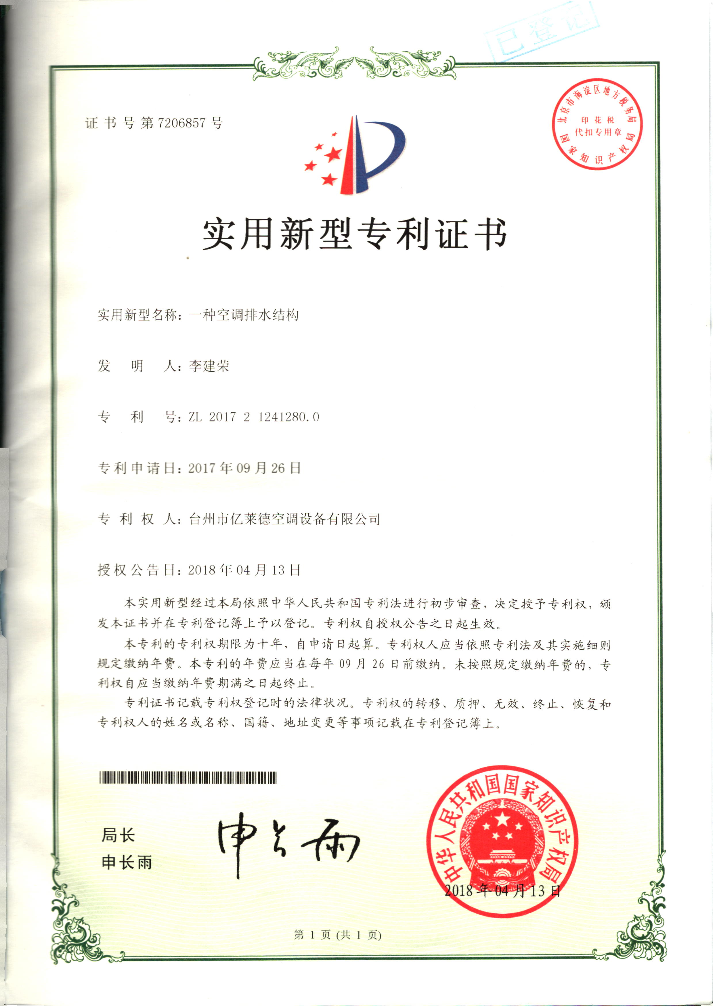實用新型專利證書--一種空調防水...