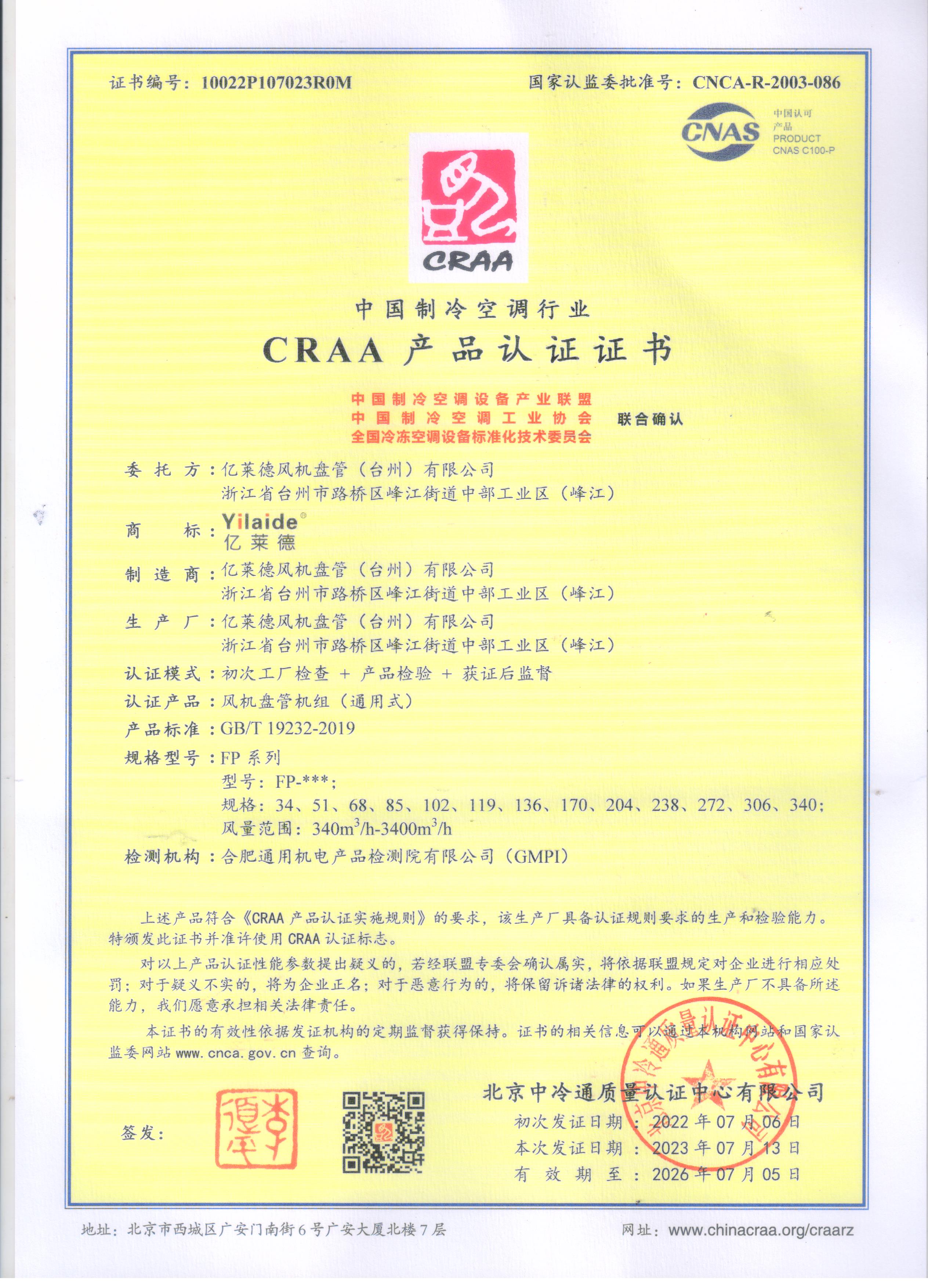 CRAA產(chǎn)品認證證書
